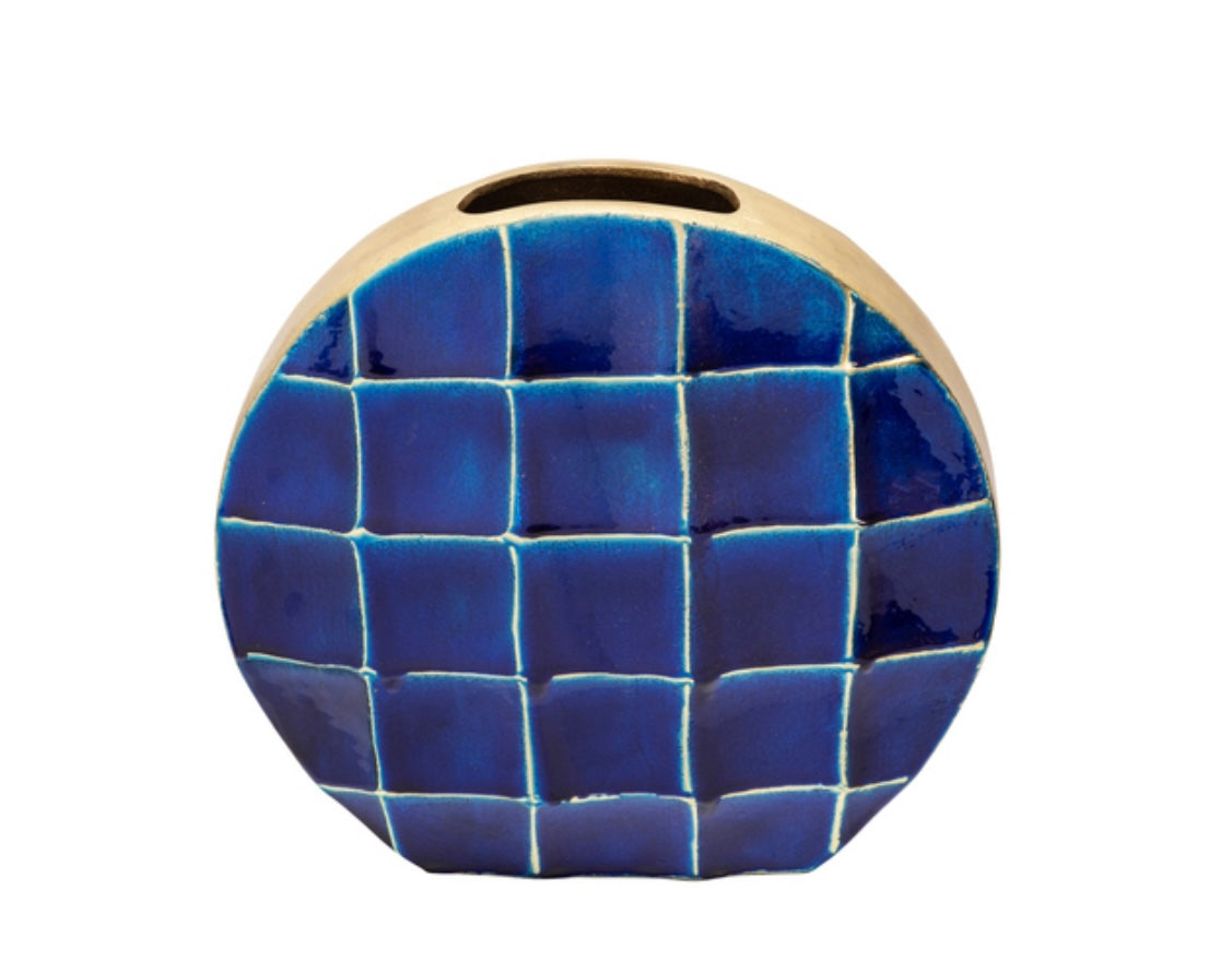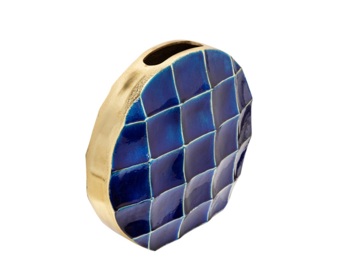 This disk inspired metal vase features a stunning blue pattern that resembles a tortoise shell. With teal highlighted lines to give the vase a beautiful coastal contrast that will enhance your interior design.